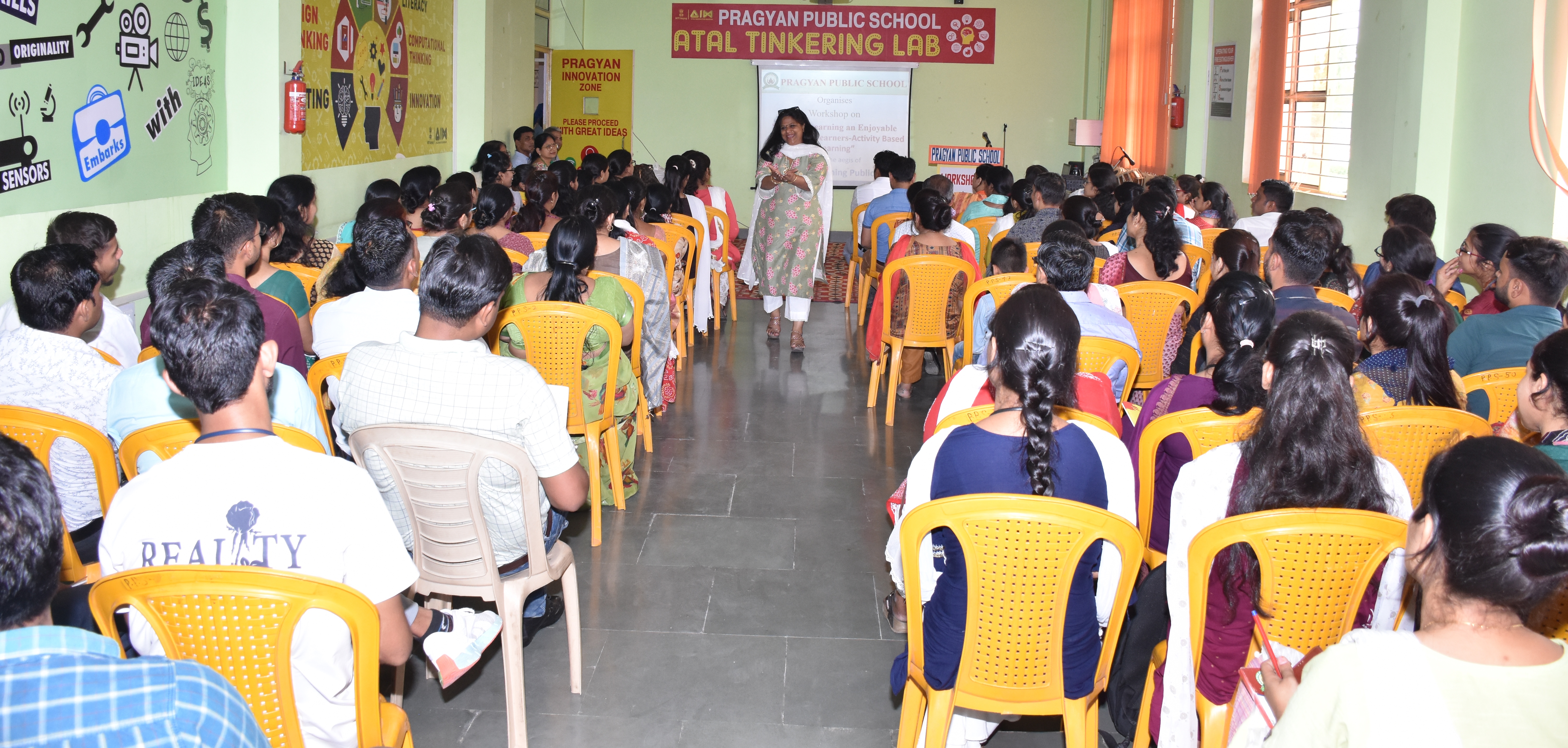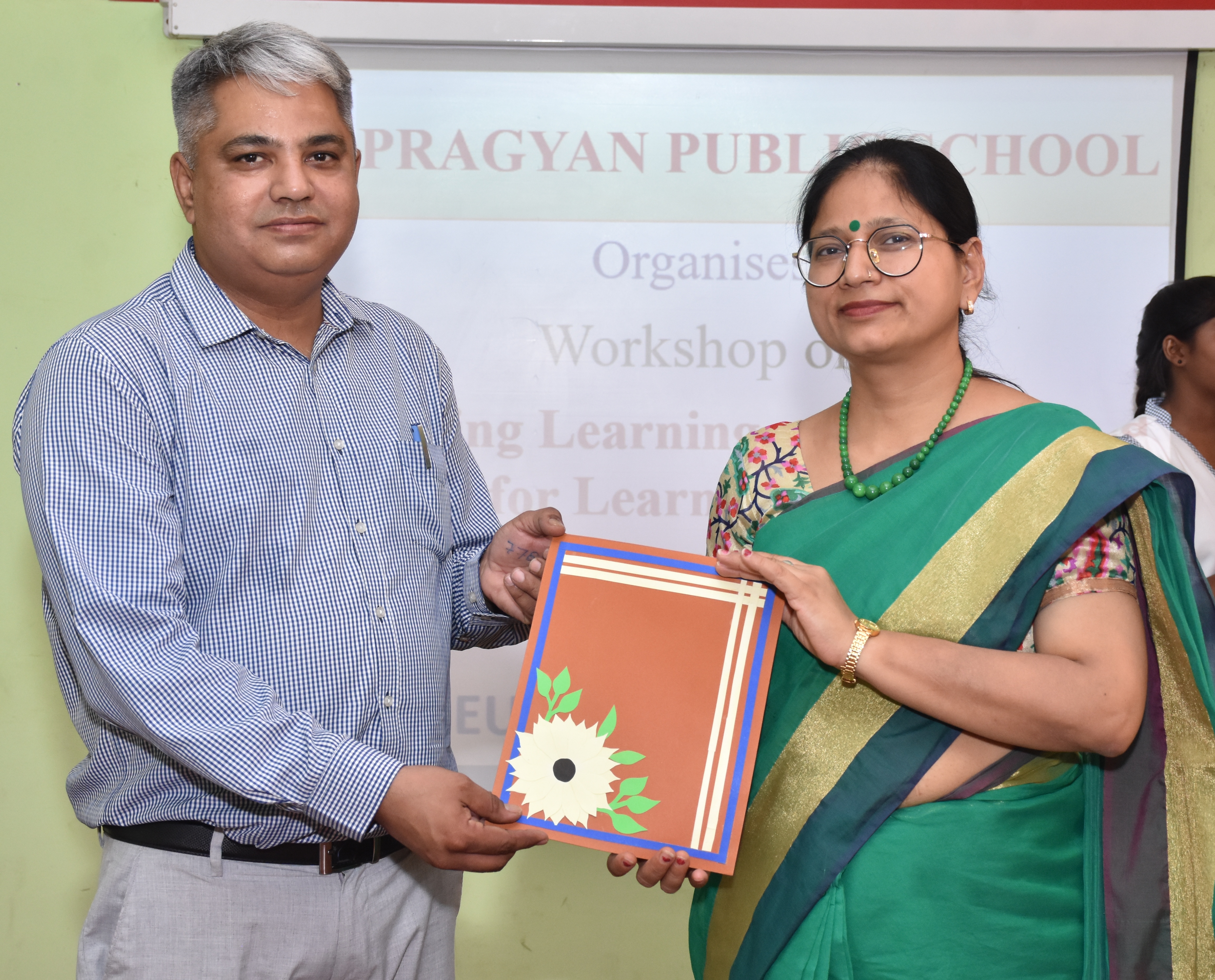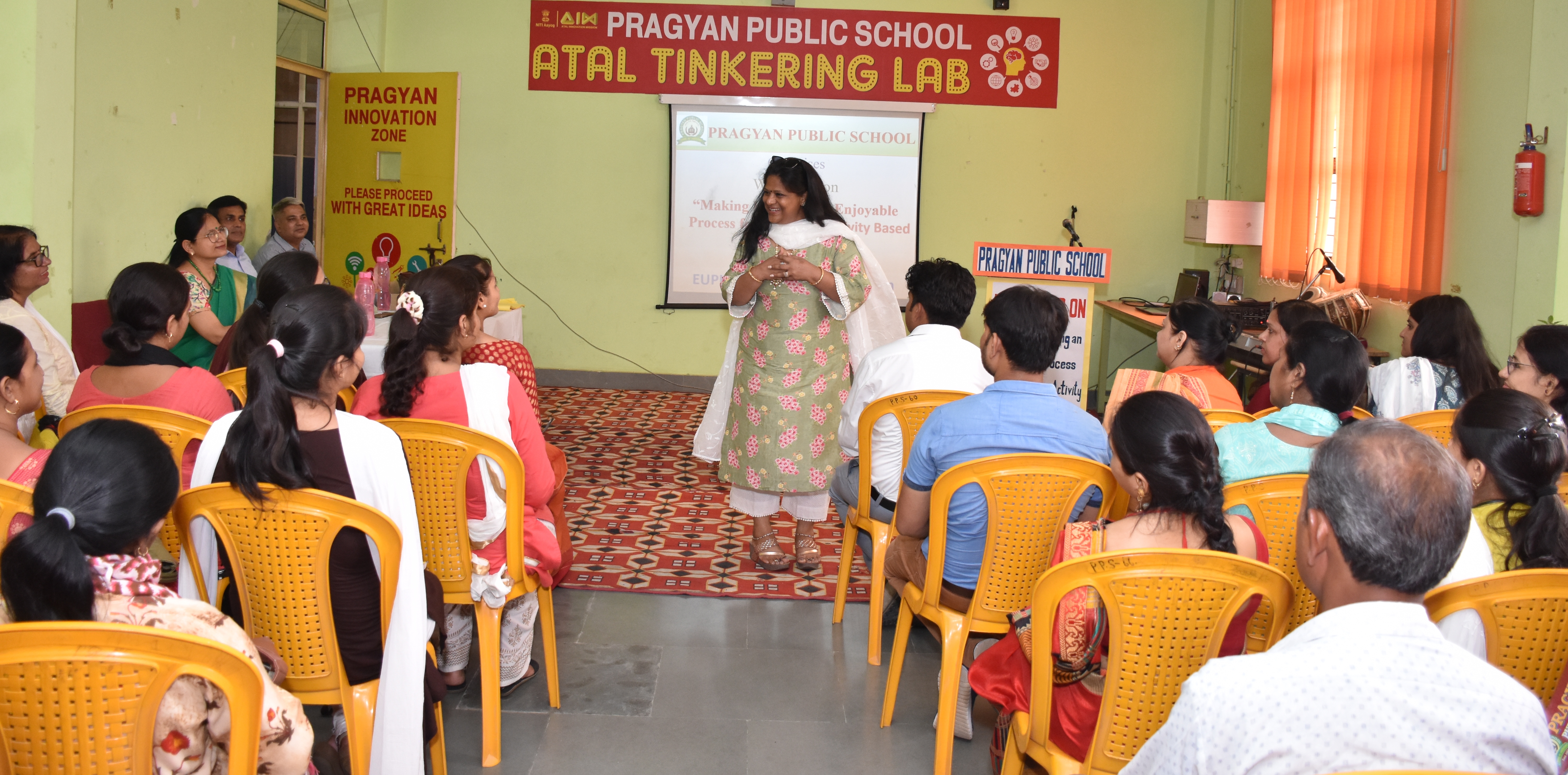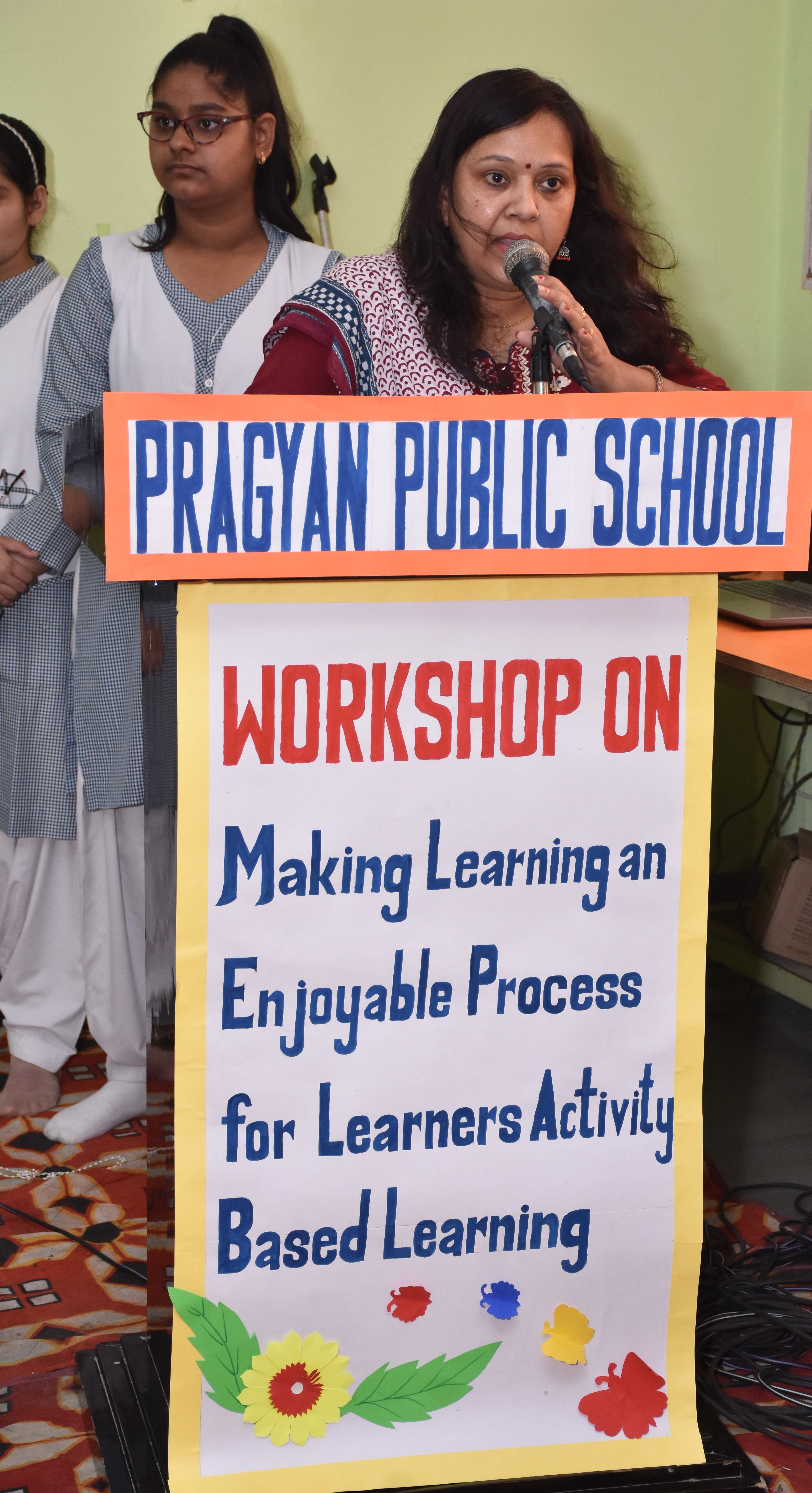 Pragyan Public School organised a workshop for teachers which was conducted by Eupheus Learning Publication. The topic of the workshop was "Making Learning an enjoyable process" ..The distinguished guests Mr. Danish and the resource person Ms. Divya Varshney lighted the lamp along with Manager of Pragyan,Mr Harish Kumar Sharma and Principal Ms.Deepti Sharma.