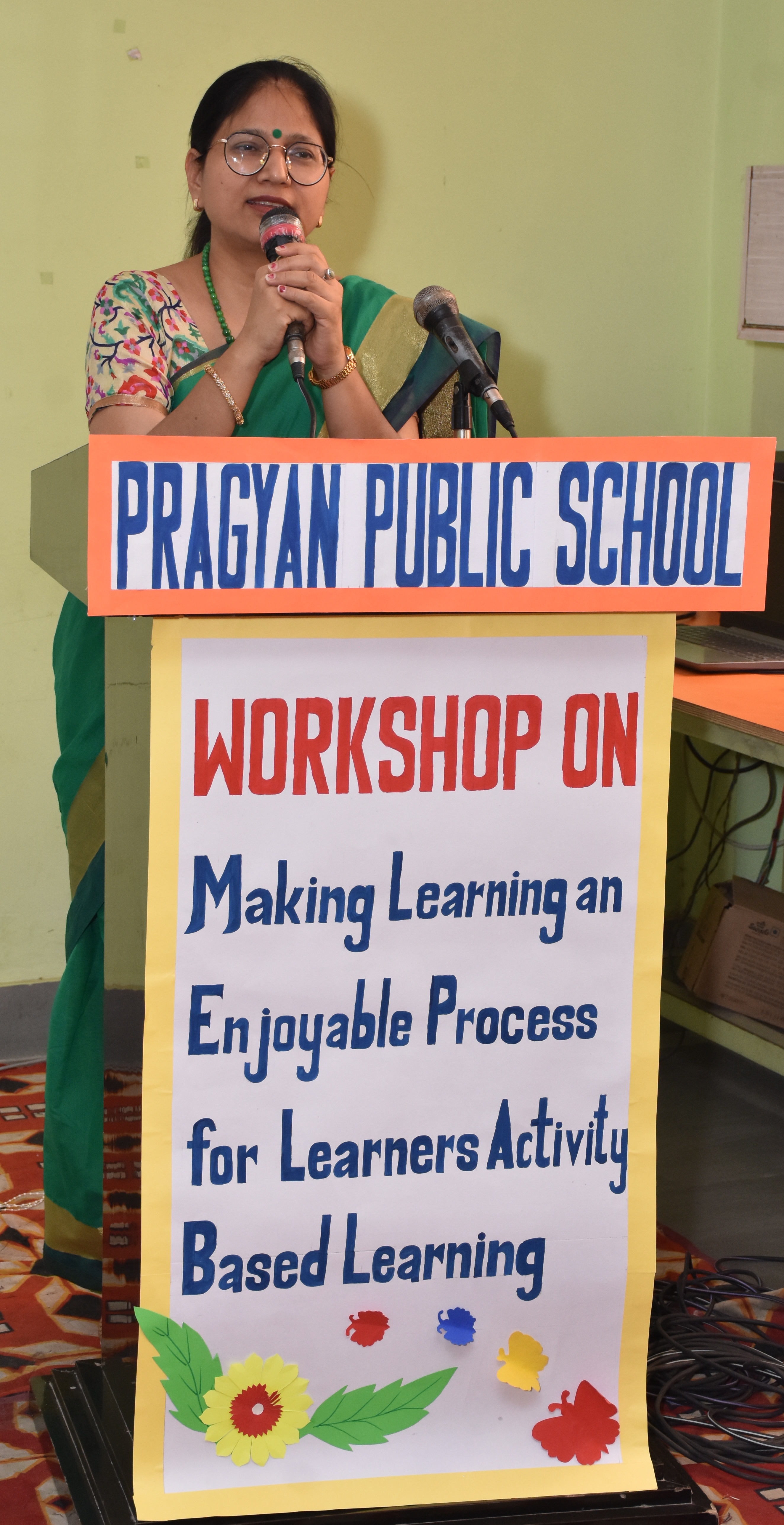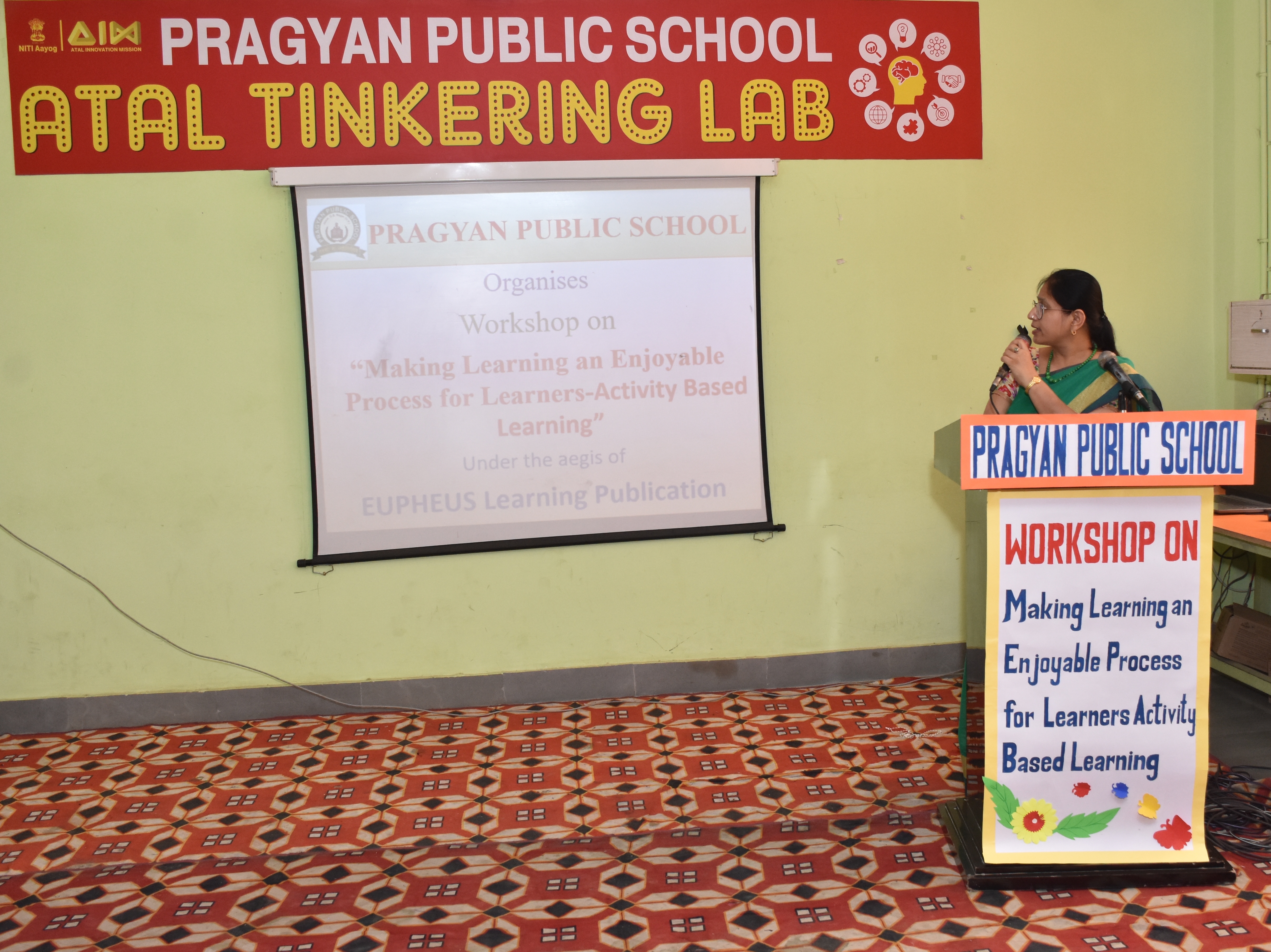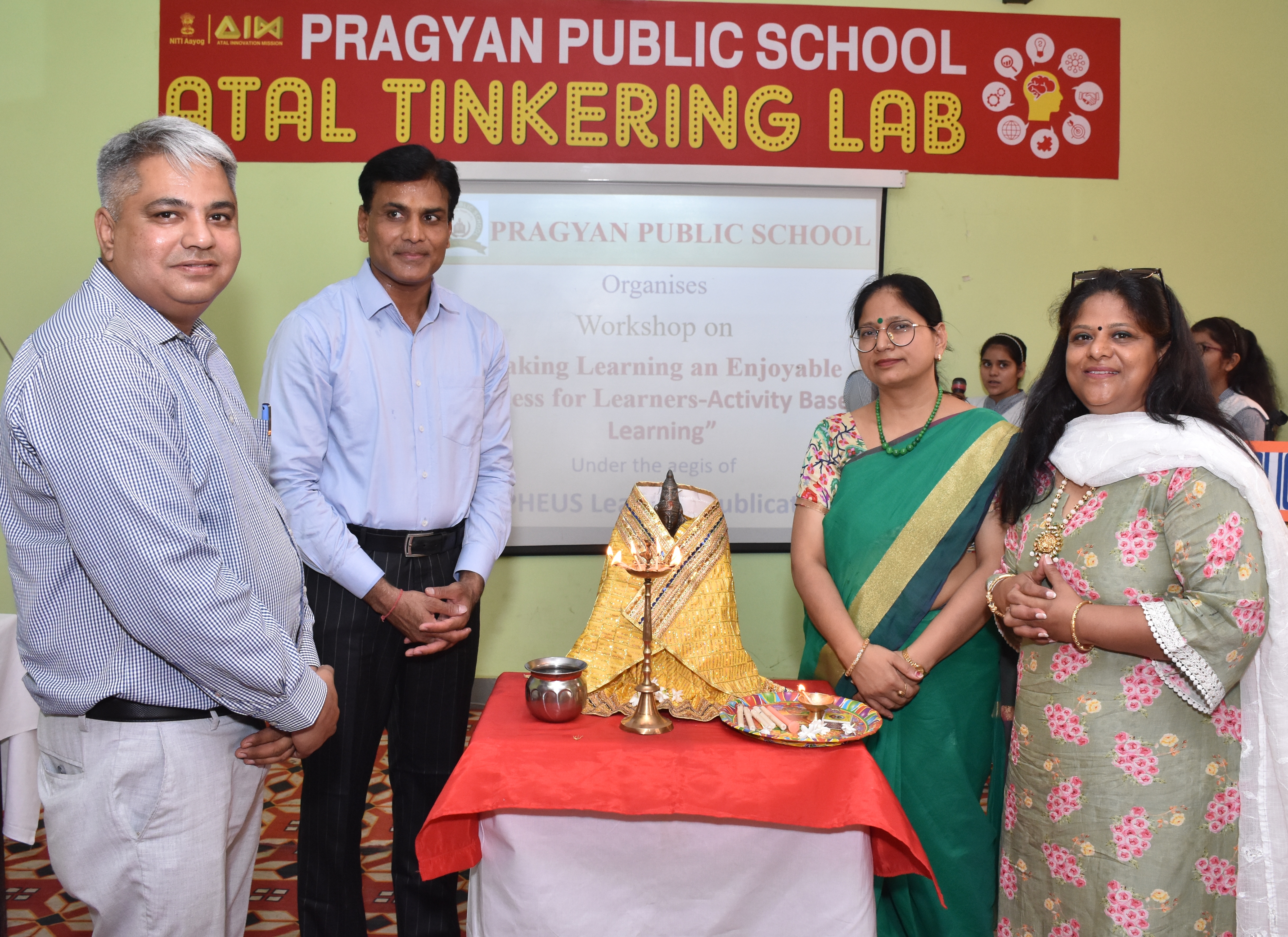 Pragyan Public School organised a workshop for teachers which was conducted by Eupheus Learning Publication. The topic of the workshop was "Making Learning an enjoyable process" ..The distinguished guests Mr. Danish and the resource person Ms. Divya Varshney lighted the lamp along with Manager of Pragyan,Mr Harish Kumar Sharma and Principal Ms.Deepti Sharma.